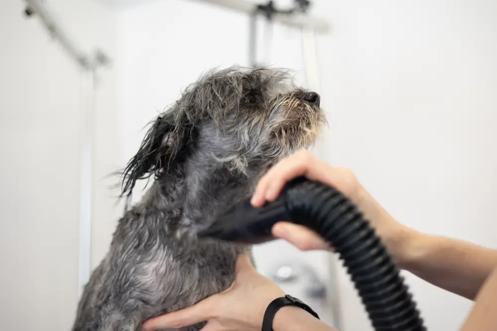 Bez stresu i pośpiechu. Suszę sierść w komfortowej temperaturze, z przerwami jeśli pies tego potrzebuje. To także moment, w którym usuwam podszerstek i delikatnie rozczesuję futro, by odzyskało lekkość i miękkość.